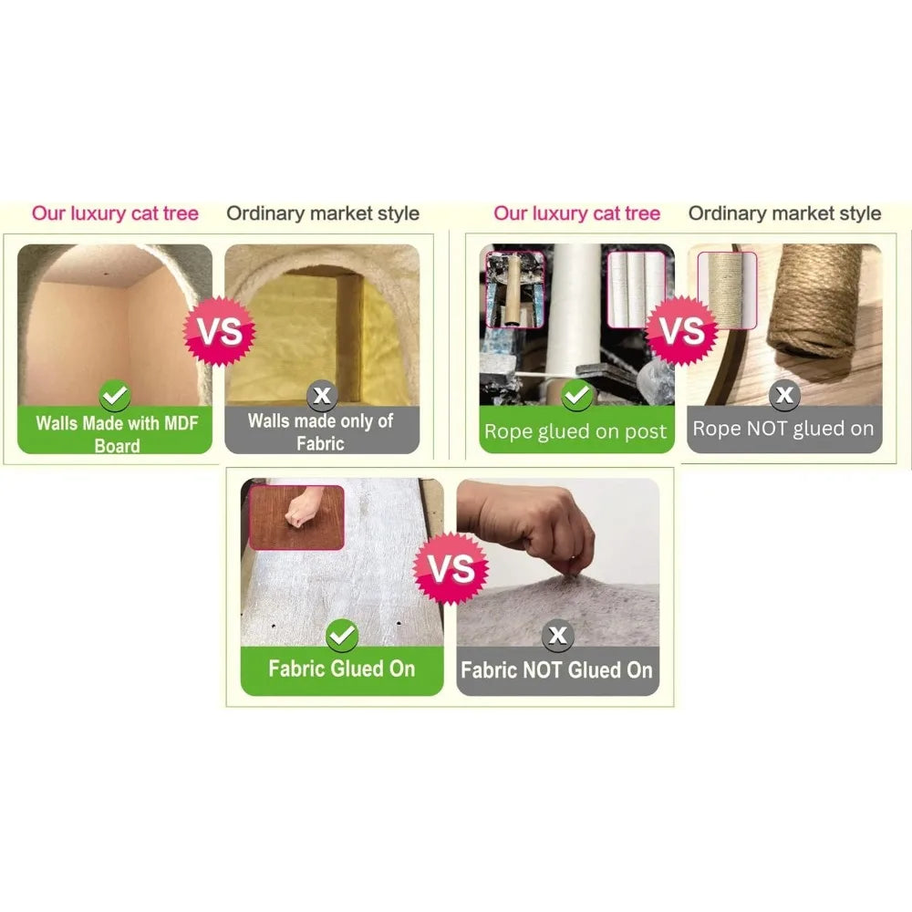 - ULTRA-DURABLE: All scratching poles and boards are completely hand-glued with thick natural sisal ropes and skin friendly plushy faux-fur fabrics, strong enough to hold up against even the most aggressive scratchers, condo walls build with MDF board holds the shape of the cat tree, this cat furniture investment will last a long time.