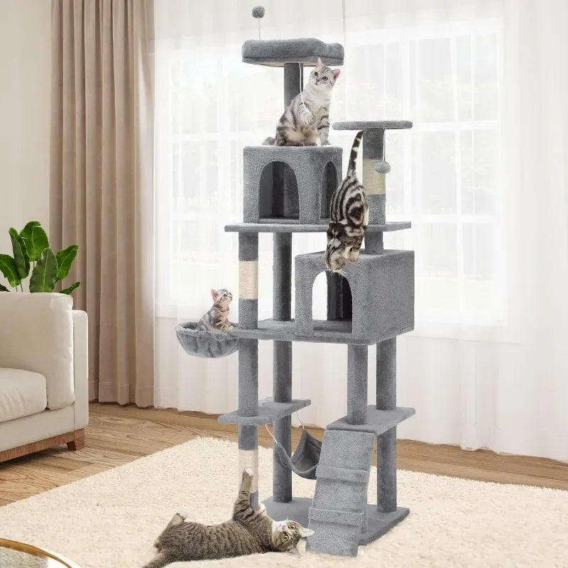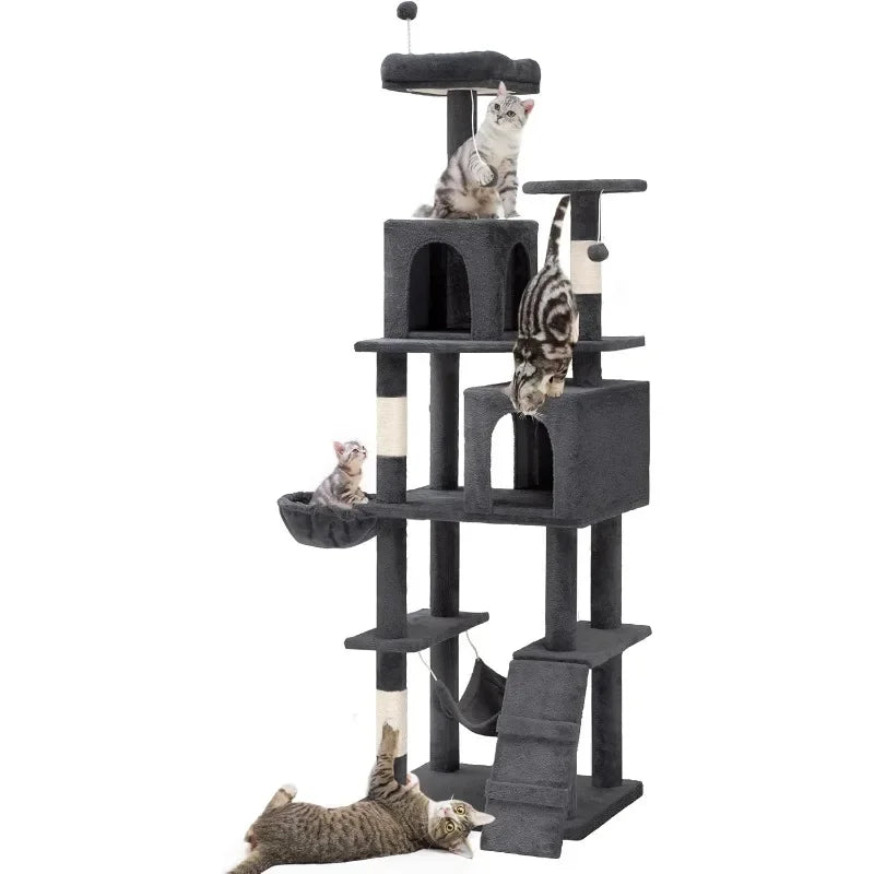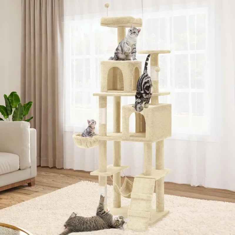 - Multifunctional Activity Center: Create a cozy retreat for your pets with our cat house; It features 2 semi-enclosed cat condos, a cozy hammock, a top perch, a cat basket, a platform, and a cat ladder; This setup provides multiple cats with their own spaces to relax and play
