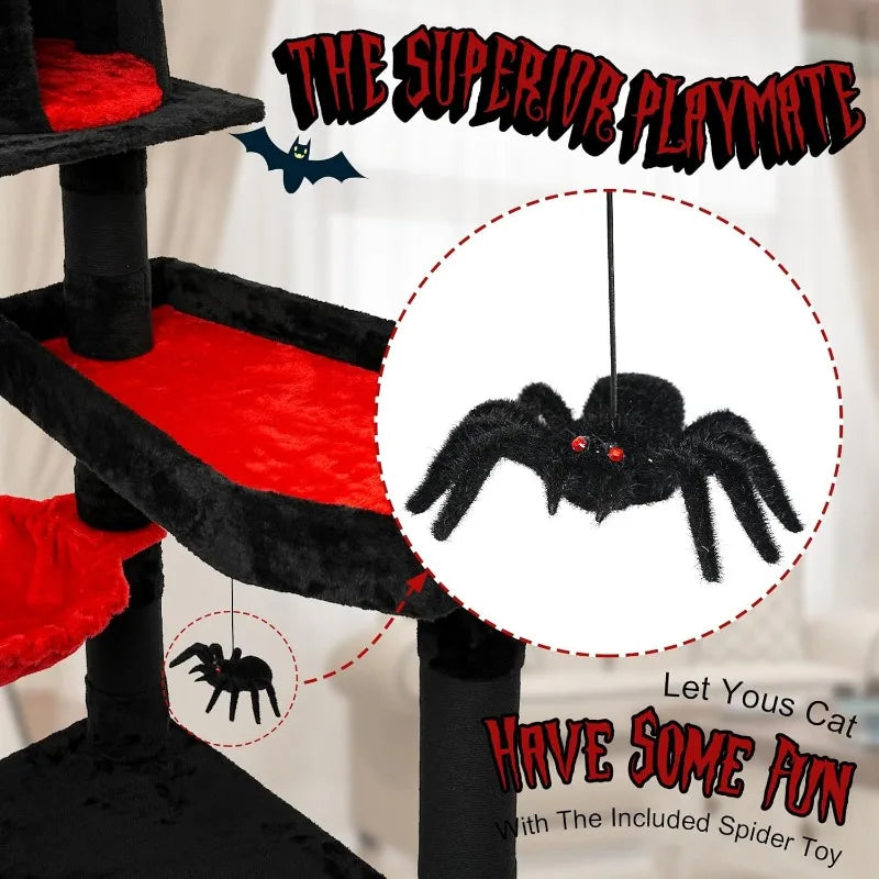 Gothic Cat Tree with Coffin Bed,55" Cat Tower Scratching Posts Spider Hanging Ball,