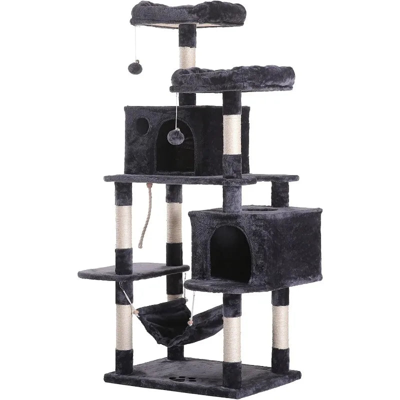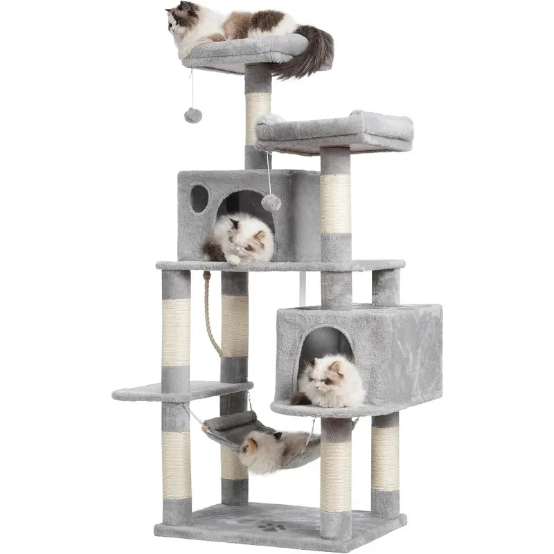 - 【MULTIFUNCTIONAL SPECIAL DESIGN】 Step-like jump multi-layer structure design of cat tower, convenient for cat's scratching, climbing, sleeping, and exercising; 2 roomy condos and 1 sturdy hammock offer luxurious napping experience for more cats use; interactive jingly balls and sisal twine to play with.