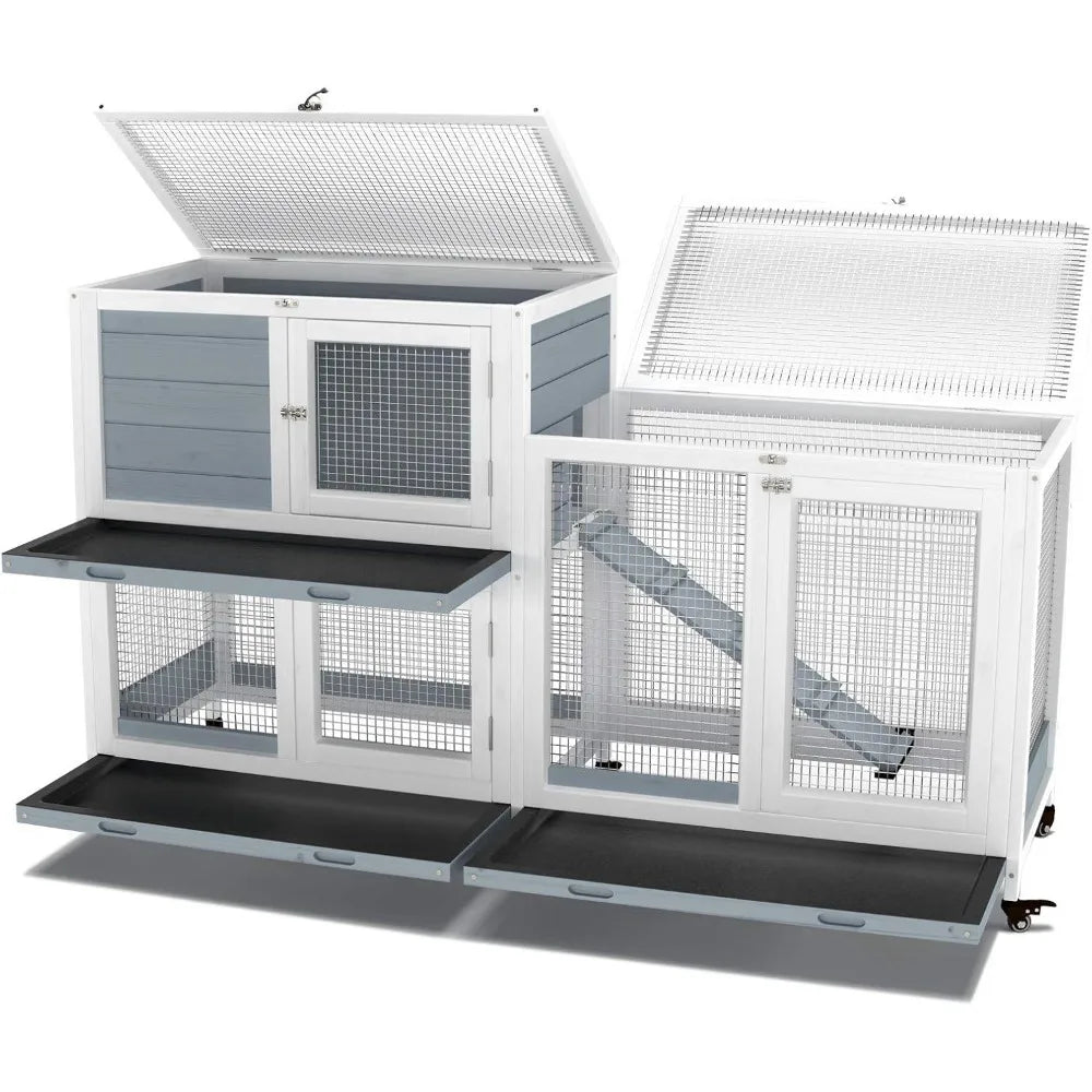 Two Floors 58" Wooden Indoor Bunny Hutch Rabbit Cage on Wheels Guinea Pig PET House for Small to Medium Animals